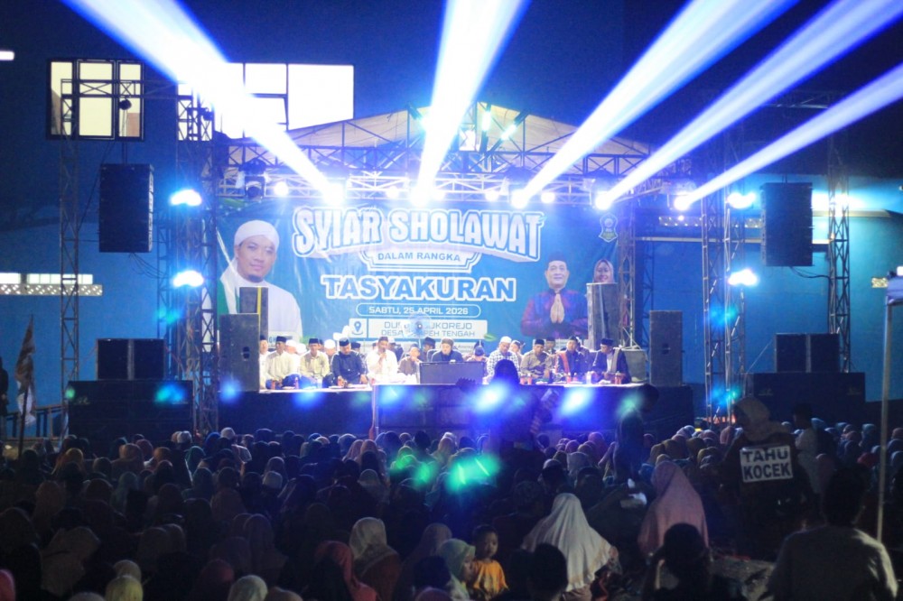 Tempeh Tengah, KIM — Kegiatan tasyakuran dapur SPPG Tempeh Tengah yang digelar pada Sabtu (25/4/2026) berlangsung meriah dan sarat makna. Warga dari berbagai penjuru desa hadir memadati lokasi acara untuk bersama-sama memanjatkan doa dan mengikuti lantunan sholawat yang dipimpin oleh Gus Khoir bersama Majelis Rijalul Mukhlisin (MRM).